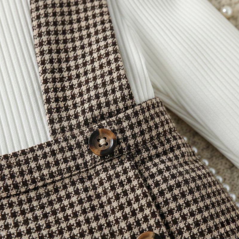 - Salopete: Padrão pied-de-poule clássico em tons marrom e bege, alças ajustáveis, botões de madeira decorativos, bolsos frontais.