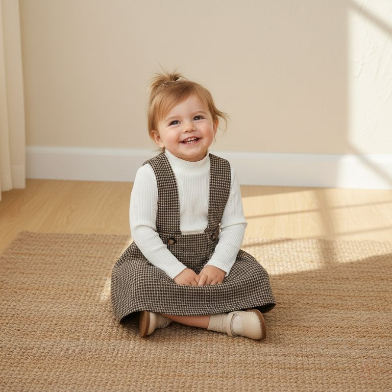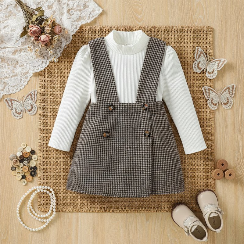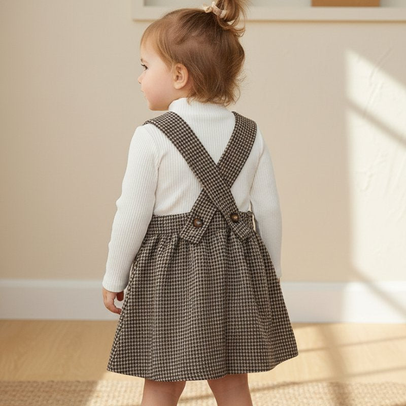 Apresentamos o Conjunto Vintage Salopete Pied-de-Poule com Blusa Canelada, uma combinação sofisticada que resgata o melhor da moda infantil atemporal. Composto por salopete em padrão pied-de-poule (xadrez miúdo) marrom e blusa branca canelada de gola alta, este conjunto é perfeito para criar looks encantadores e cheios de personalidade.
