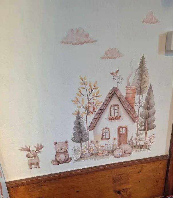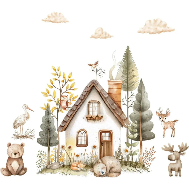 - Design encantador: Com uma linda casa de madeira cercada por animais adoráveis como ursos, veados e pássaros, esses adesivos trazem a natureza para dentro do quarto.